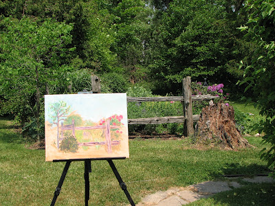 The above photograph is the vignette that I chose to paint at Good Earth today. I have admired that split-rail fence ever since I laid eyes on it at my first-ever plien air painting class back in July 2011 - all silvery in the sunlight and the rhododendrons in full bloom - simply inspiring!!